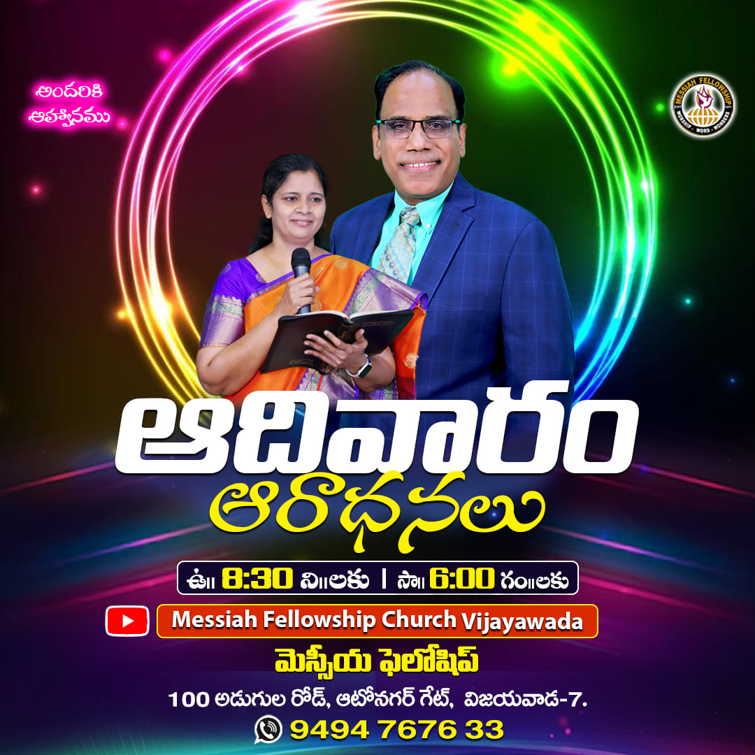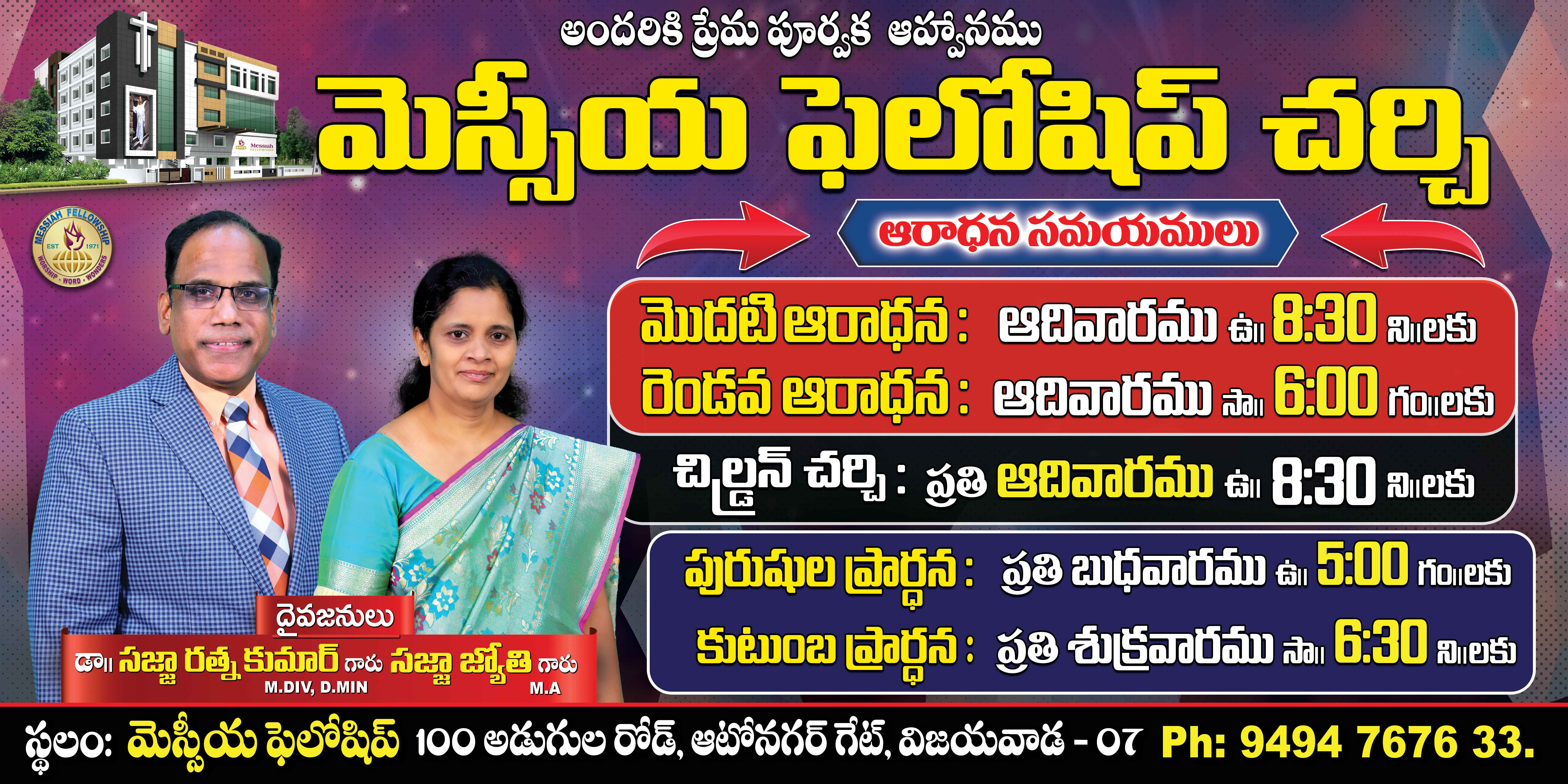 Messiah Fellowship is a community of faith believers in Vijayawada. Messiah Covnetion Center is located at 100 Feet Road, Autonagar Gate, Vijayawada. It is where Dr. Sajja Ratna Kumar minister the Word of God.